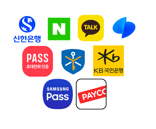 네이버 인증서, 카카오인증, 토스인증서, PASS 국민은행, 삼성패스, 페이코, 신한은행 간편인증서로 인증 진행 가능 (인증서 미 보유시 지점 방문으로 진행)
