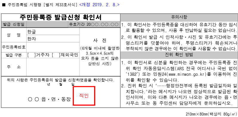 대면으로 신청가능 재발급 비용: 5,000원 실물증명사진 필요 (6개월 이내 촬영본 규격: 3.5cm x 4.5cm) 주변 동사무소, 주민센터 방문신청 온라인 신청은 임시신분증 발급 불가능 이전에 분실한 신분증과 동일사진이라도 6개월 이내면 사용가능